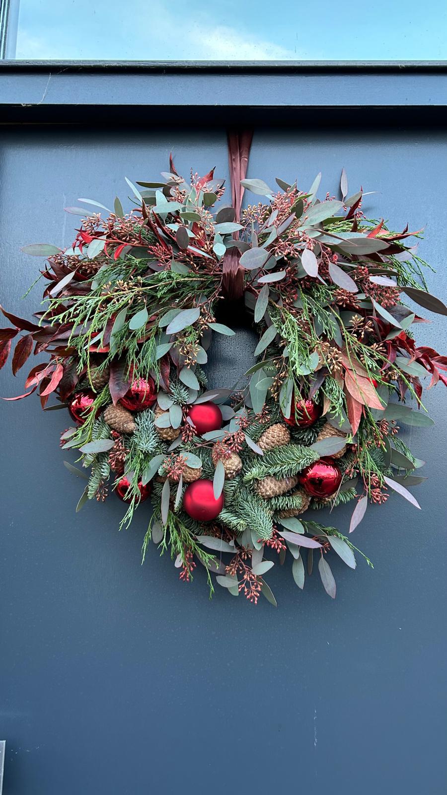 Kerstkrans Rood, gebruik gemaakt van rode kerstballen. maar mogelijk in elke kleur of wens. diameter krans ca. 55cm